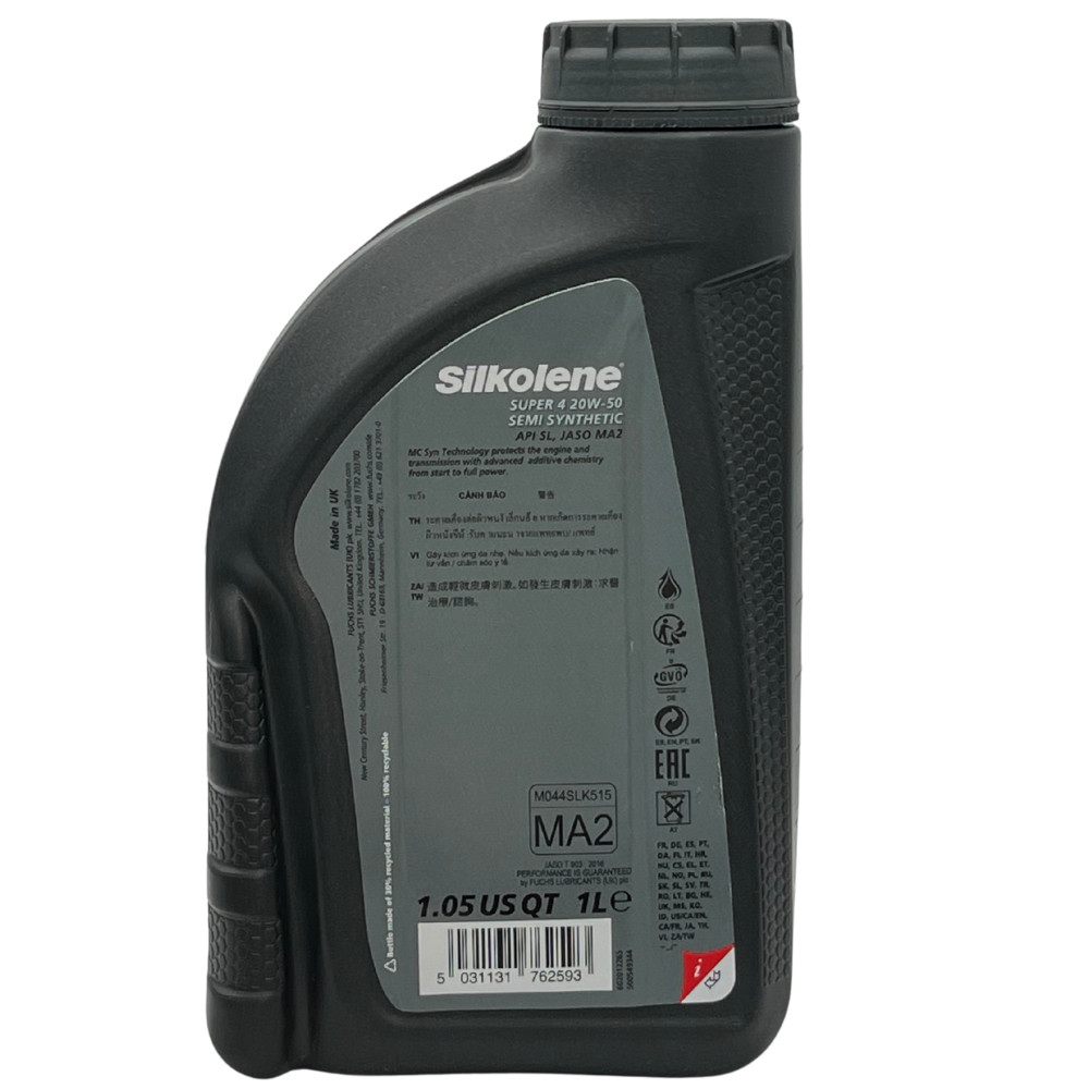 A SILKOLENE SUPER 4 20W-50 egy félszintetikus 4 ütemű motorolaj, amely kiváló általános teljesítményt biztosít modern motorkerékpárok számára.