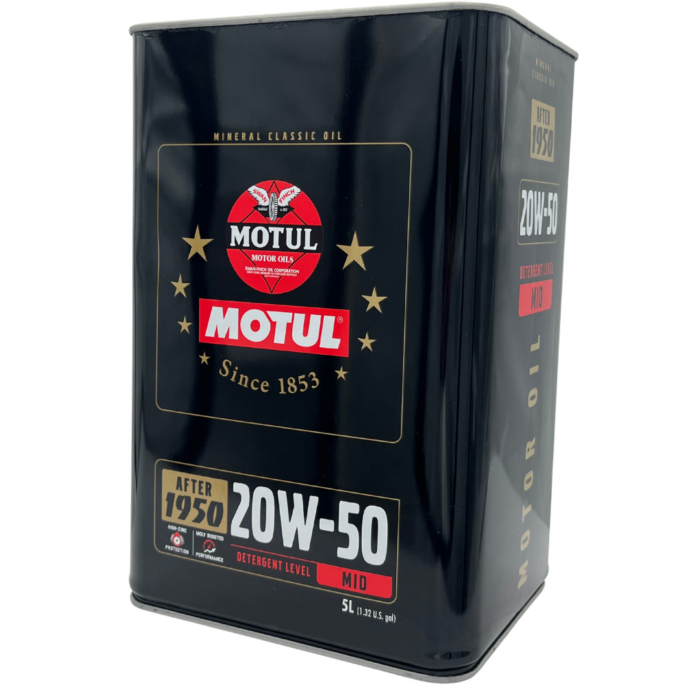 Jóváhagyások: API SF/CF A MOTUL CLASSIC SAE 20W-50 kiváló minőségű finom keverékű többfokozatú ásványolaj, amit az 1950 után gyártott oldtimerek minden évszakban történő használatához fejlesztettek ki. Régi motorkerékpárokhoz szintén használható. Teljesíti a kornak megfelelő gyártóművi előírásokat, kiemelkedő kenést, tökéletes korrózióvédelmet, stabil olajnyomást és optimális kompressziót biztosít. Csekély olajfogyasztást és minimalizált olajveszteséget lehet elérni a SAE 20W-50 viszkozitás eredményeként. További előnyös tulajdonsága a szélsőséges viszonyok mellett is biztosított kopás elleni védelem, valamint a jó tapadási készség.