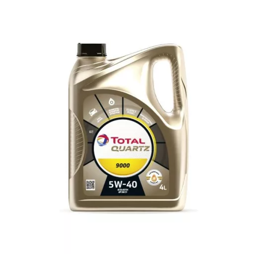A TOTAL QUARTZ 9000 5W40 motorolajat a legkorszerűbb benzin-, és dízelüzemű motorokhoz fejlesztették ki.Különösen alkalmas turbófeltöltésű, többszelepes és közvetlen befecskendezéses motorokhoz.A legnehezebb üzemelési körülmények között is használható (városi forgalomban, autópályán), minden évszakban. Tökéletesen megfelel minden katalizátorral felszerelt gépkocsikhoz. Használható ólommentes üzemanyaggal és LPG-vel üzemelő gépkocsikhoz is. T valamint a legfejlettebb gyártói előírásoknak, mely garancia a tökéletes és állandó minőségre. Szintetikus technológiával készült motorolaj, mely az oxidációval szembeni rendkívüli ellenálló képességének köszönhetően hosszabb olajcsere periódust biztosít.Alacsony hőmérsékleten tanúsított rendkívüli folyékonysága miatt könnyű hidegindítást biztosít. Nagyon jól ellenáll a magas hőmérsékletnek is. A TOTAL QUARTZ 9000 5W40 közvetlenül az indítás utáni optimális kenés révén megvédi a mechanikus részeket, ezáltal hozzájárul a motor élettartamának meghosszabbításához és teljesítményének fenntartásához. A motor legkényesebb részeit is tisztán tartja, a fokozott detergens és diszpergens tulajdonságainak köszönhetően.